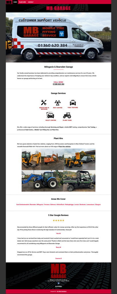 My clients required a new website and domain name for their garage. They provide Servicing and Repair, reliable MOT testing, comprehensive Taxi Testing, a professional Valet Centre, a Mobile Tyre Fitting Van and Plant Hire services. Based in Torrance but also catering for clients around Bearsden, Milngavie, Bishopbriggs, Glasgow and surrounding areas.
